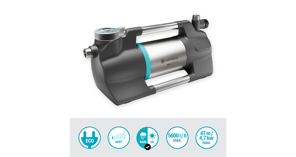De Besproeiingspomp 5600 Silent+ van GARDENA is verrassend door zijn sterke prestaties en innovatieve functionaliteiten. Deze pomp heeft een stroomverbruik van slechts 900 watt en is dankzij de efficiënte hydraulica relatief energiezuinig. Hij heeft een doorvoercapaciteit van 5600 liter per uur bij een opvoerhoogte van 47 meter (4,7 bar). Met deze pomp kan je op betrouwbare wijze water uit een regenton, waterbron of ondergronds waterreservoir pompen vanaf een diepte tot maar liefst 8 meter, voor bewatering. De Silent+ is ontwikkeld in Duitsland en is bijzonder stil in gebruik, met slechts 45 dB geluidsdruk op 5 m afstand, dankzij de watergekoelde meerfasige technologie. Dankzij deze technologie is de gebruikelijke ventilator niet nodig omdat de overtollige warmte via het water wordt afgevoerd. Dit zorgt voor maximale efficiëntie en minimaal geluid. Doordat de Silent+ weerbestendig is, kan hij het hele seizoen buiten in de tuin blijven staan, zelfs in constante regen en vocht. Dat betekent dat je hem direct bij de waterbron kan plaatsen, voor een korte en efficiënte wandeling. De rubberen poten zorgen dat hij stabiel op de grond staat. De stevige stand zorgt ook dat de makkelijk toegankelijke schakelaar eenvoudig bediend kan worden. Je kan hem zelfs omzetten met je voet! Beveiligingsmechanismen zoals de motor-oververhittingsbeveiliging en de ingebouwde voorfilter voorkomen dat je elektrische pomp beschadigd raakt en vergroten zijn duurzaamheid. De weerbestendige pomp is gemaakt van hoogwaardige materialen, zoals roestvrij stalen water- en motorbehuizing en aluminium handgrepen. Door je waterreservoir te gebruiken, bespaar je kostbaar drinkwater. Dat is goed voor je portemonnee en voor het milieu, vooral tijdens droge zomers. De besproeiingspomp is voorzien van een keramische verzegeling met een dubbele afdichting en een roestvrijstalen as tussen de hydraulica en de motor. De aansluiting voor de aanzuigslang en de twee uitlaten, waarvan één 180° kan worden gedraaid, zijn ook van roestvrij staal gemaakt. Je hebt de optie om meerdere toepassingen tegelijkertijd te bedienen. De duurzame pomp is dankzij de grote vulopening makkelijk te vullen, en dankzij het ontwateringsventiel is hij ook makkelijk te legen om hem tegen vorst te beschermen. Integreer deze Besproeiingspomp gemakkelijk in het GARDENA Smart System, via de Power Adapter (art. nr. 19095/19096-20), die apart verkrijgbaar is. Registreer de Besproeiingspomp 5600 Silent+ online en GARDENA geeft je 5 jaar garantie. Voel de kracht van GARDENA pompen. Meer dan 40 jaar deskundigheid in pompen voor afvoer, bewatering en huishoudelijk gebruik.
